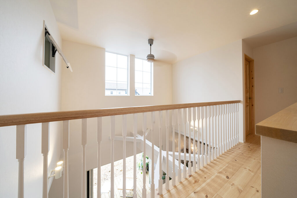 2階に上がっていただくと、大きな吹き抜けがありここから1階の様子を見ることができます。